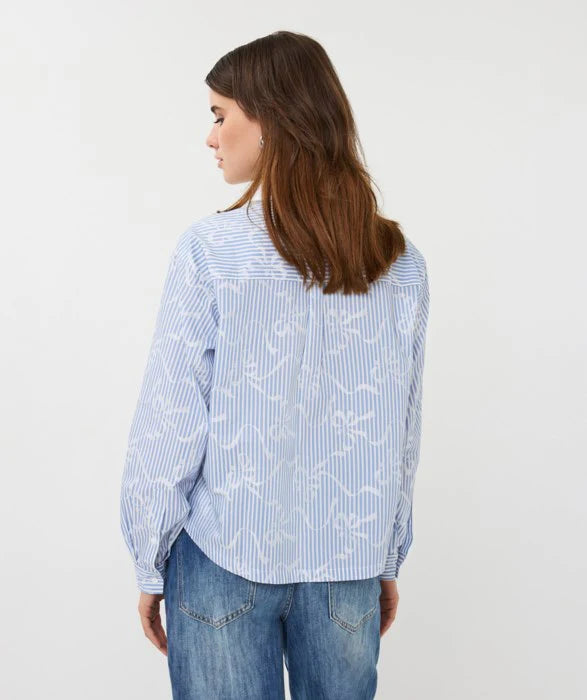 The Spencer  Blouse by EsQualo with long sleeves and a pointed collar. This model has an allover stripe pattern and is decorated with  little bows. The blouse closes with buttons.