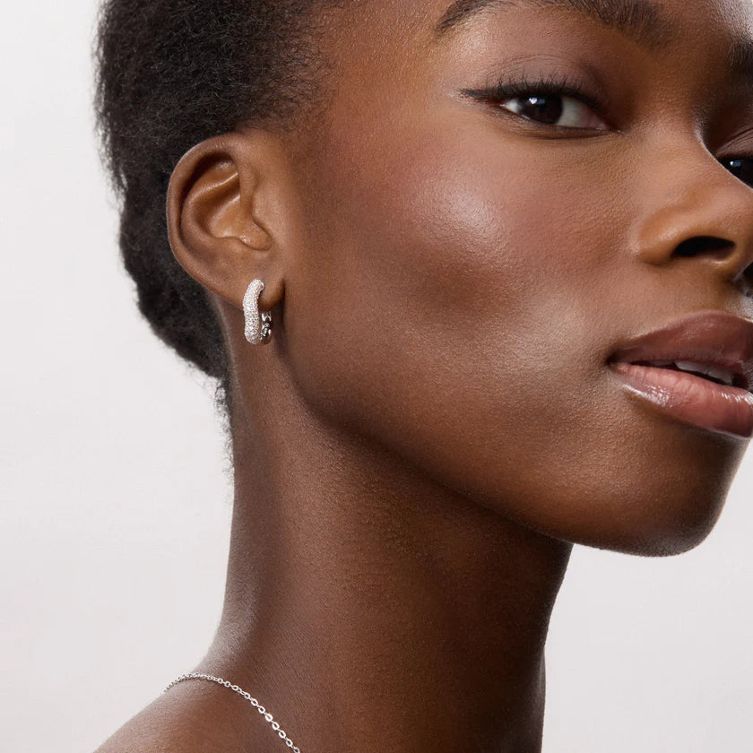 Sculptural and endlessly versatile, the Nova Wave Hoops balance light and movement in a softly curved silhouette. Available in sterling silver or 14k gold vermeil over sterling silver, each reversible hoop features a polished metal finish on one side and hand-set white cubic zirconia on the other. The hinge-and-click closure ensures a seamless, secure fit. Designed to flow effortlessly from day to night, these 18mm hoops bring modern elegance—and a touch of energy—to every look.
